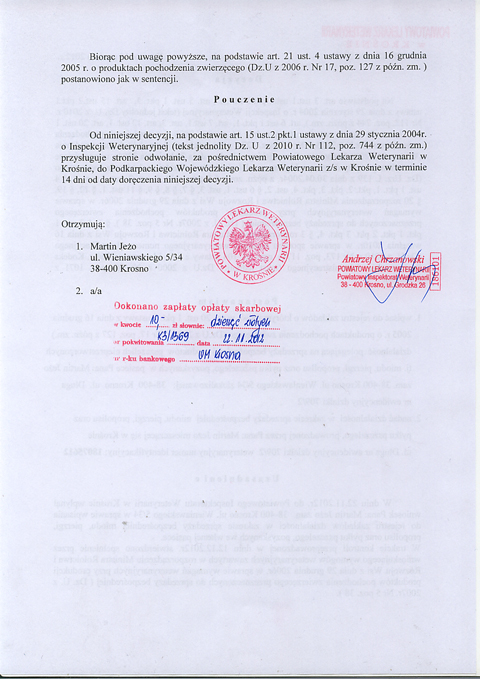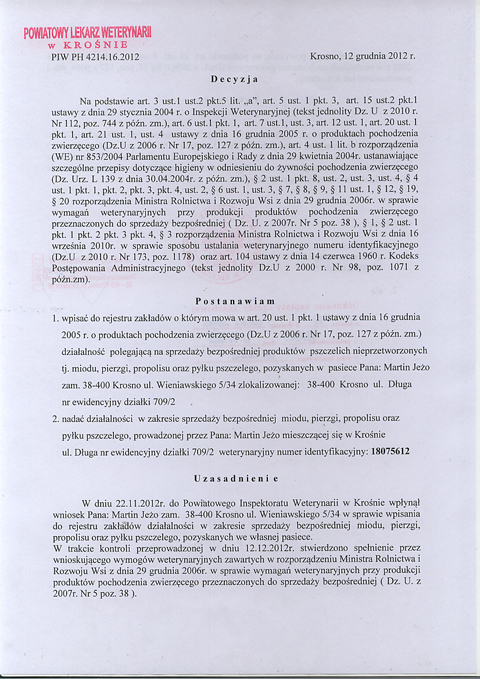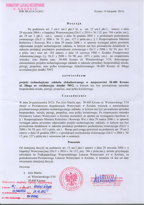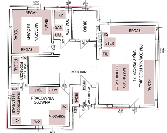 PRACOWNIA PRODUKCJI WĘZY PSZCZELEJ: Powierzchnia 34,6m². Podłoga terakota zakończona cokołem. Ściany zmywalne aż po sufit. Pomieszczenie wyposażone w bieżącą wodę, kratkę ściekową zamontowaną w posadzce, przewód wentylacji grawitacyjnej zakończony stosowną kratką oraz gaśnicę proszkową, czujnik dwutlenku węgla.